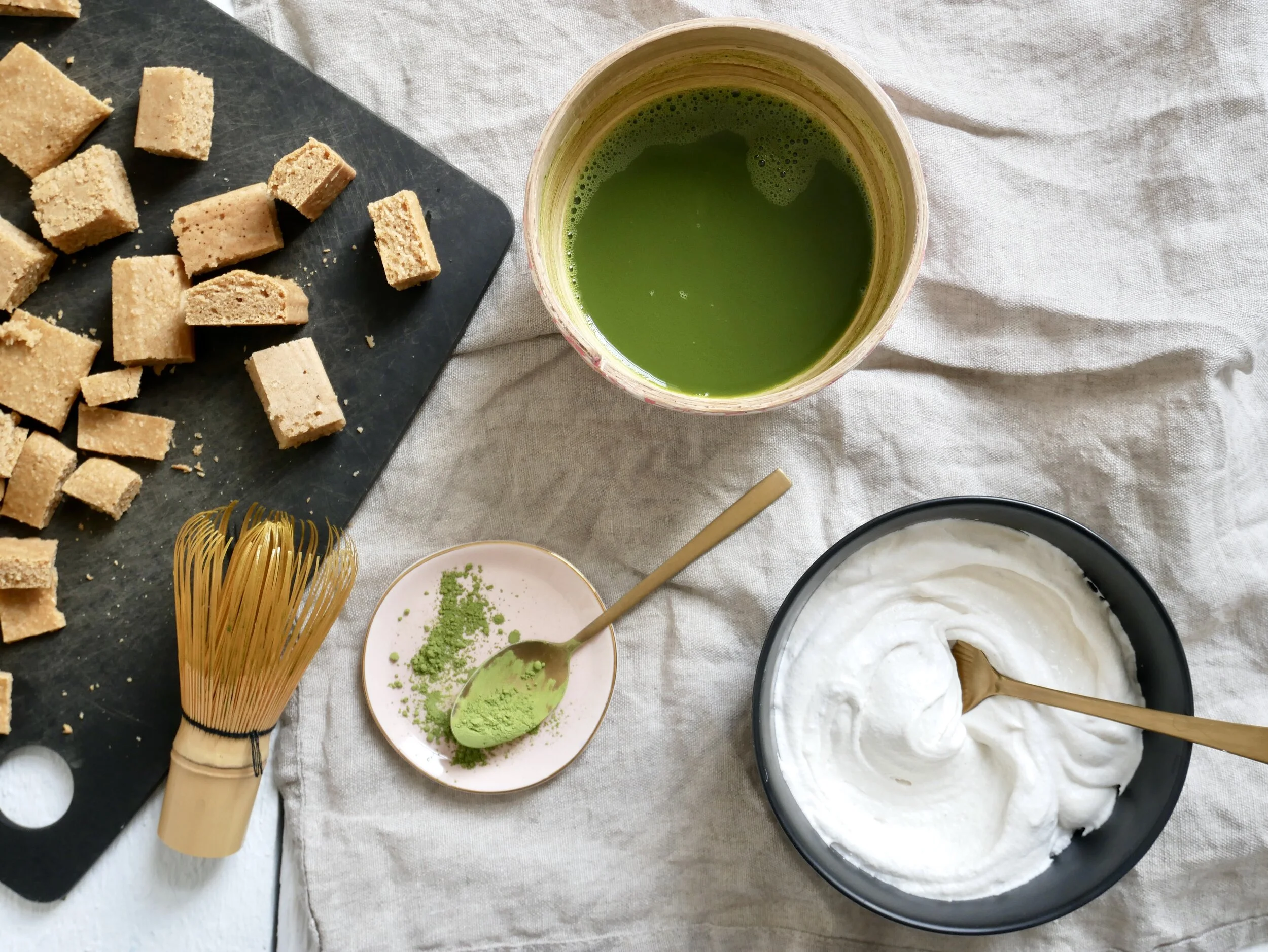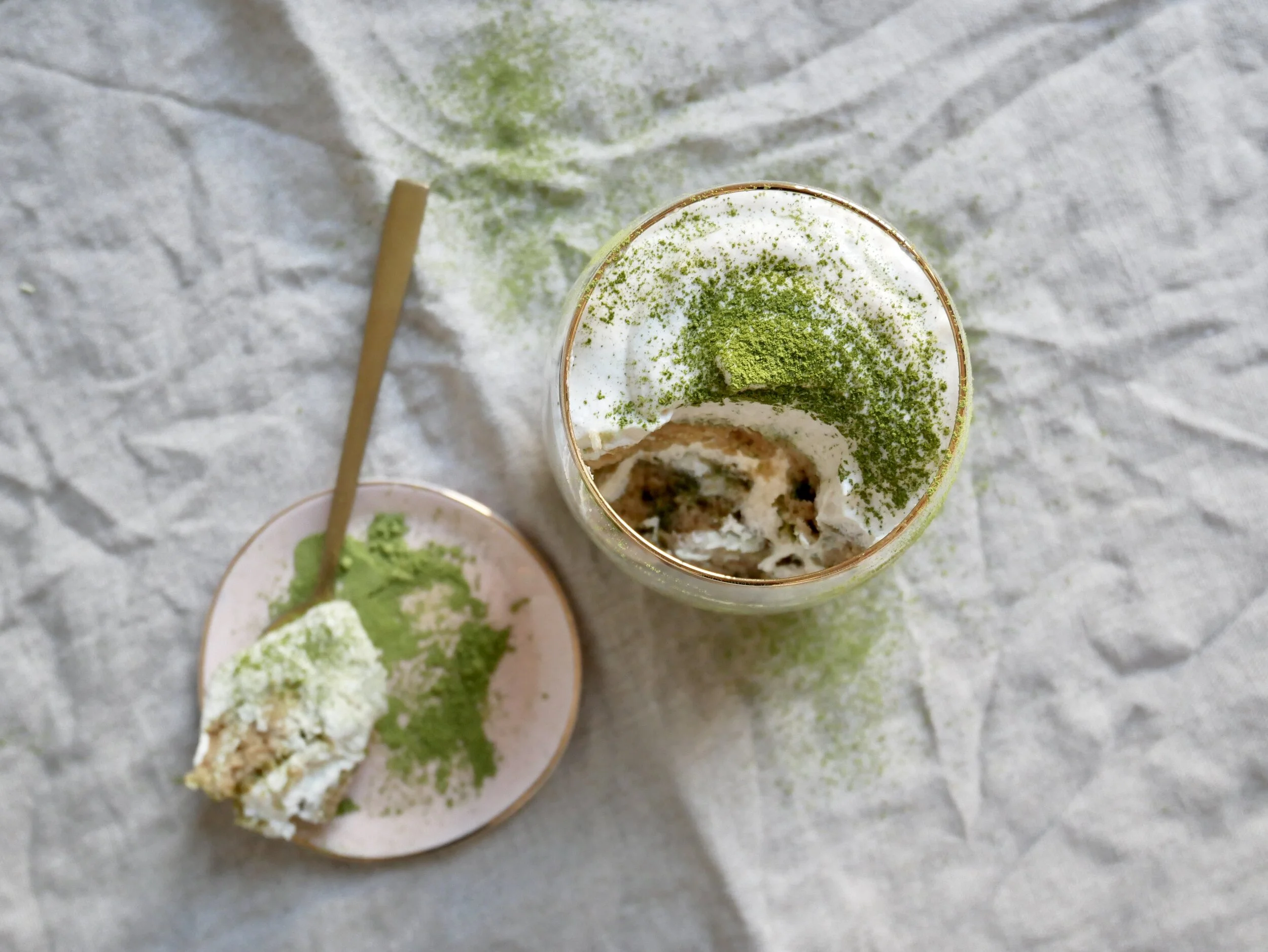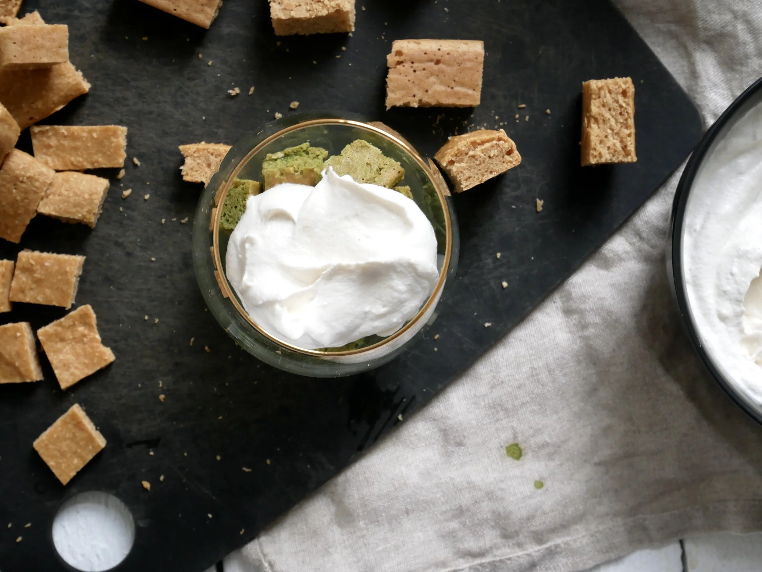 Now dunk the the biscuit pieces into the cooled matcha and add layers of them to your glasses while adding layers of the cashew cream in between.