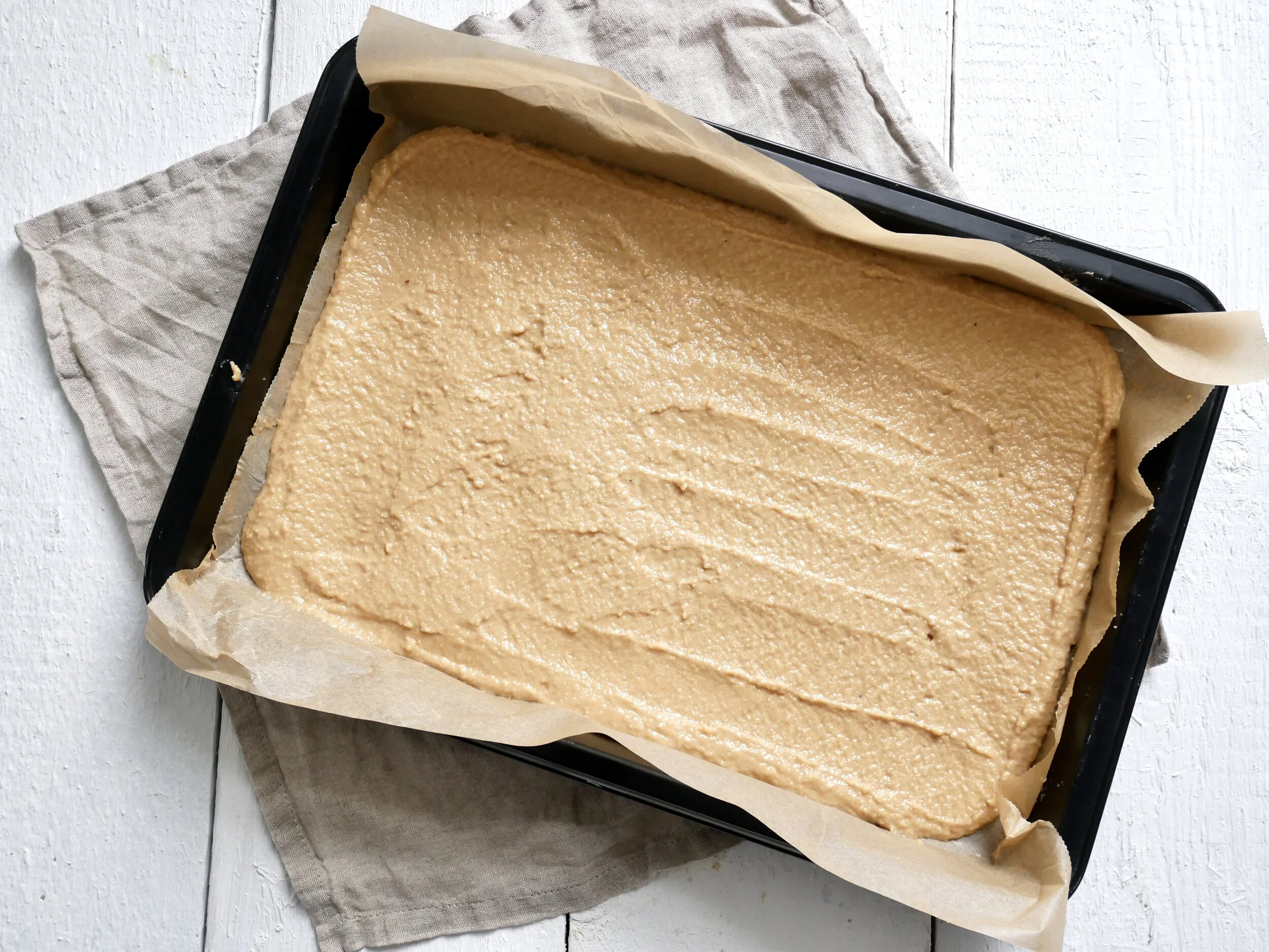 Transfer the dough to a baking tray or baking dish lined with parchment paper and spread out thinly. Then bake for about 25mins until a wooden prick inserted in the centre comes out clean.
