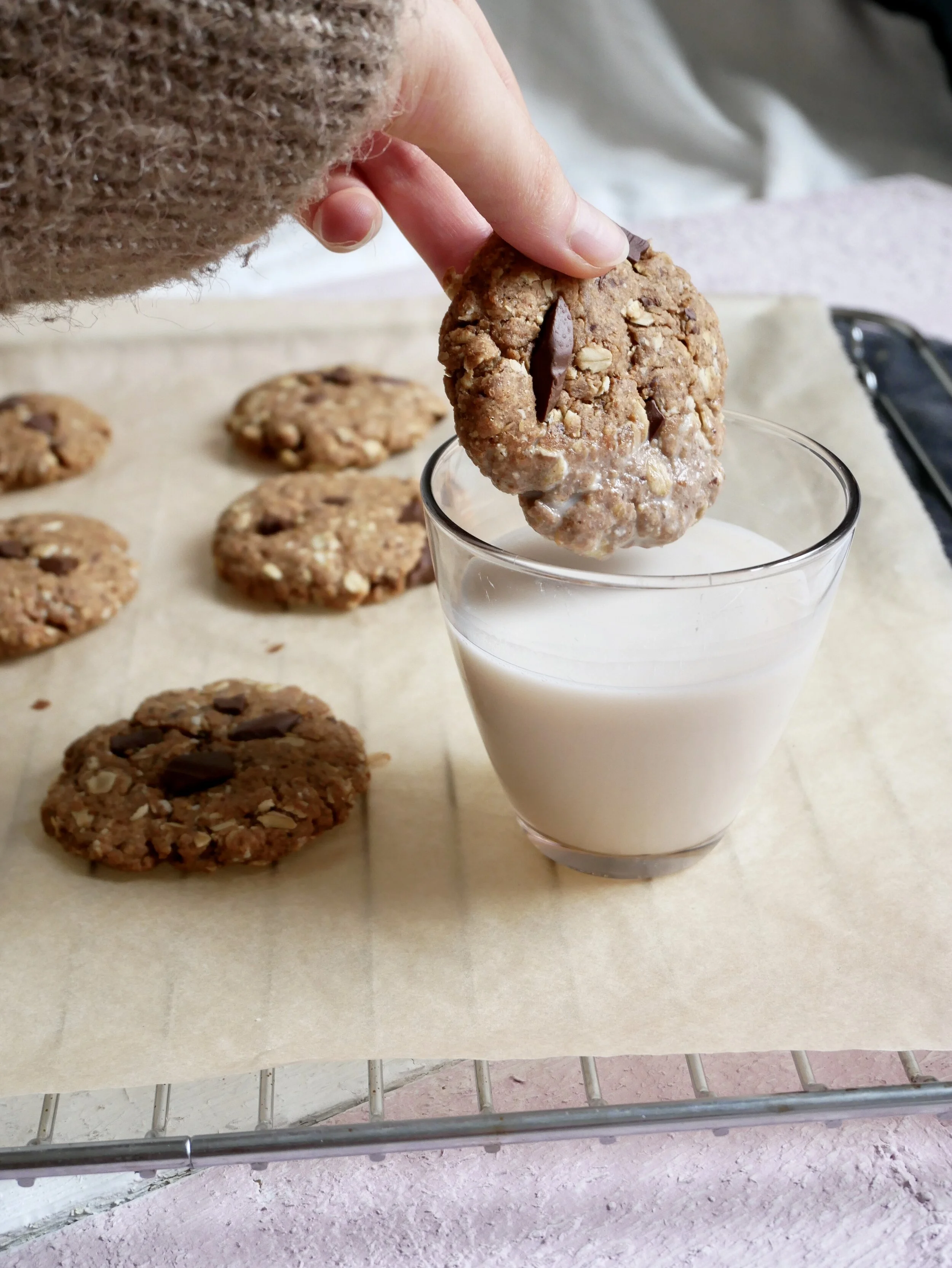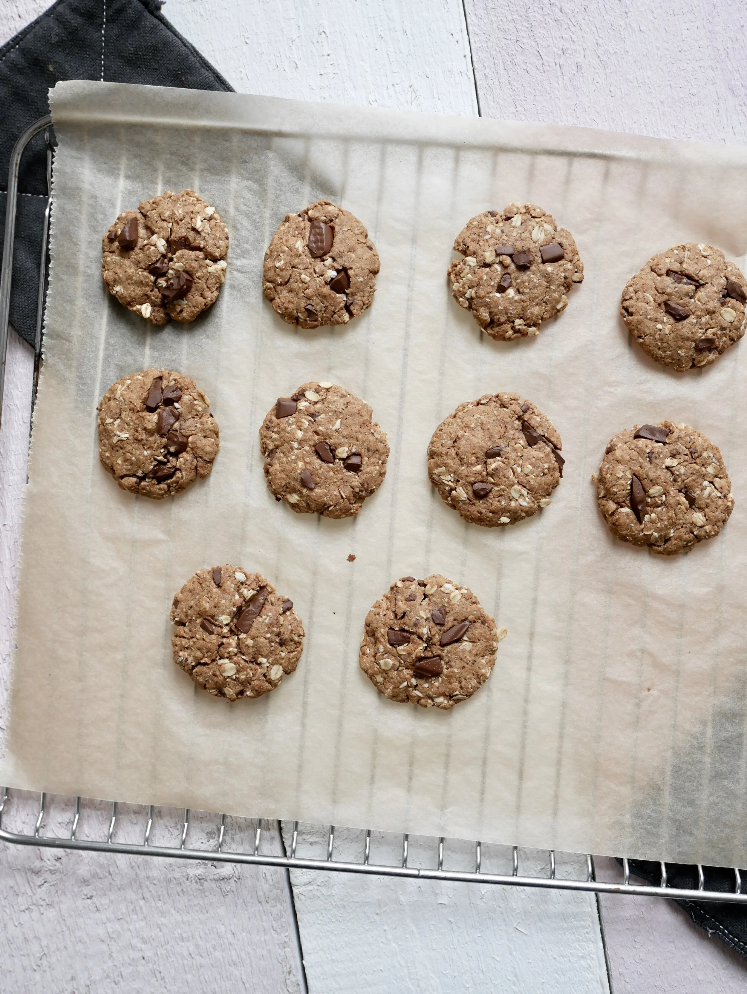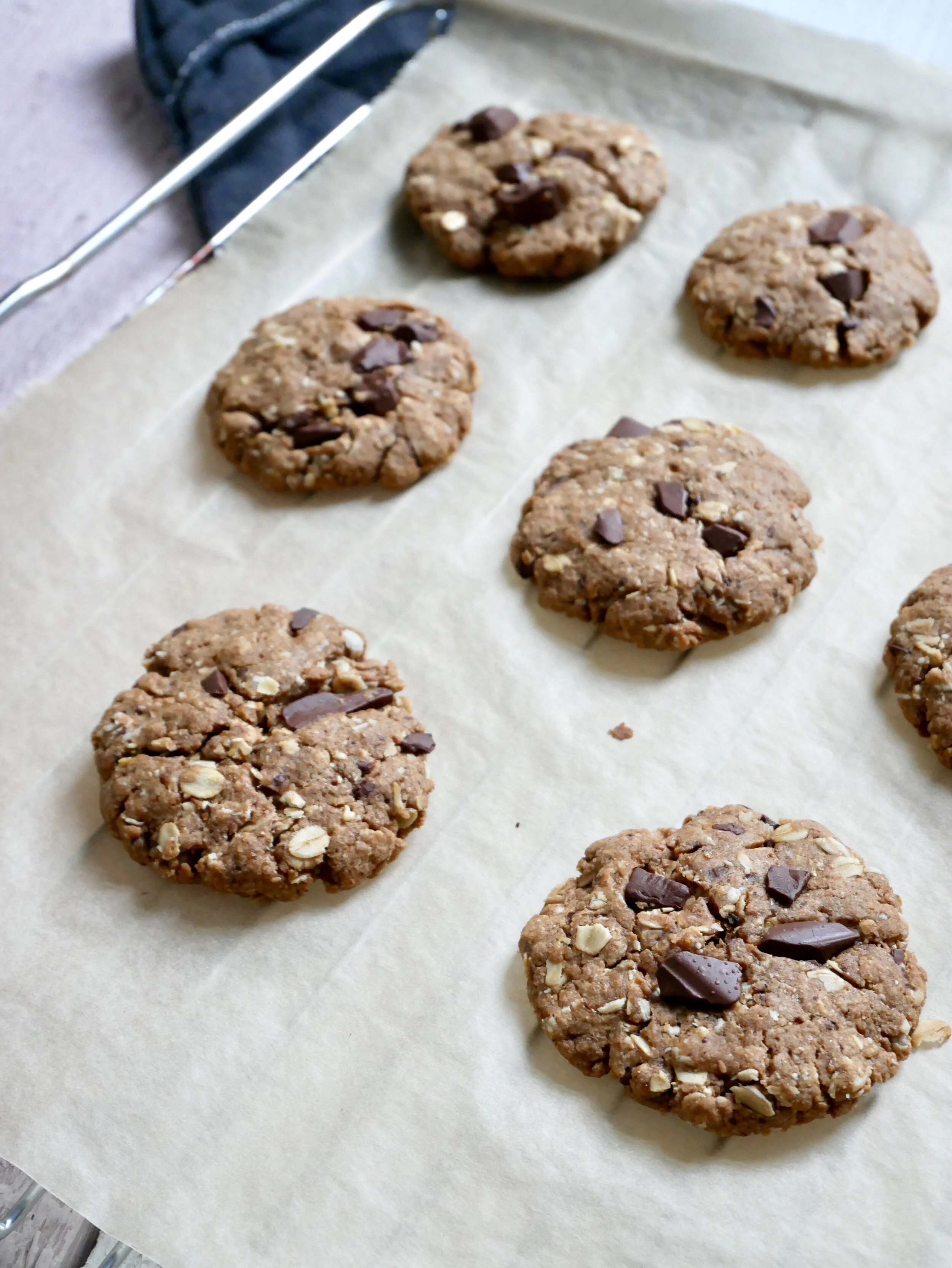 Zwar habe ich hier einfache vegane dunkle Schokolade verwendet aber zu diesen Keksen passt fast alles! Ob vegane weiße, “Milch-” oder Zartbitterschokolade, Nüsse, Rosinen oder Cranberries ist dabei ganz egal, es schmeckt alles ziemlich gut!