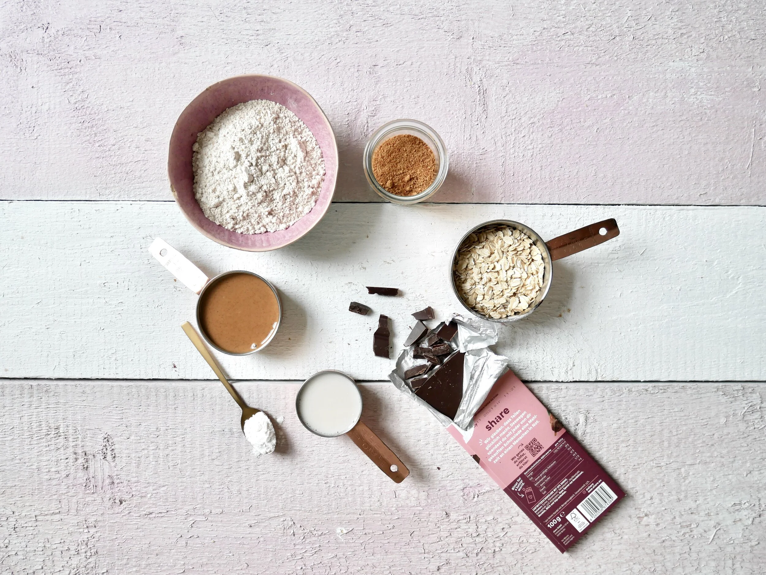 Ich habe hier das Weizenvollkornmehl von Share verwendet, aber ihr könnt die Kekse natürlich auch mit einem anderen Mehl backen. Wenn ihr feineres Mehl, also kein Vollkorn, benutzen wollt dann gebt gegebenenfalls ein wenig mehr Mehl hinzu, falls der Teig sonst zu klebrig ist.