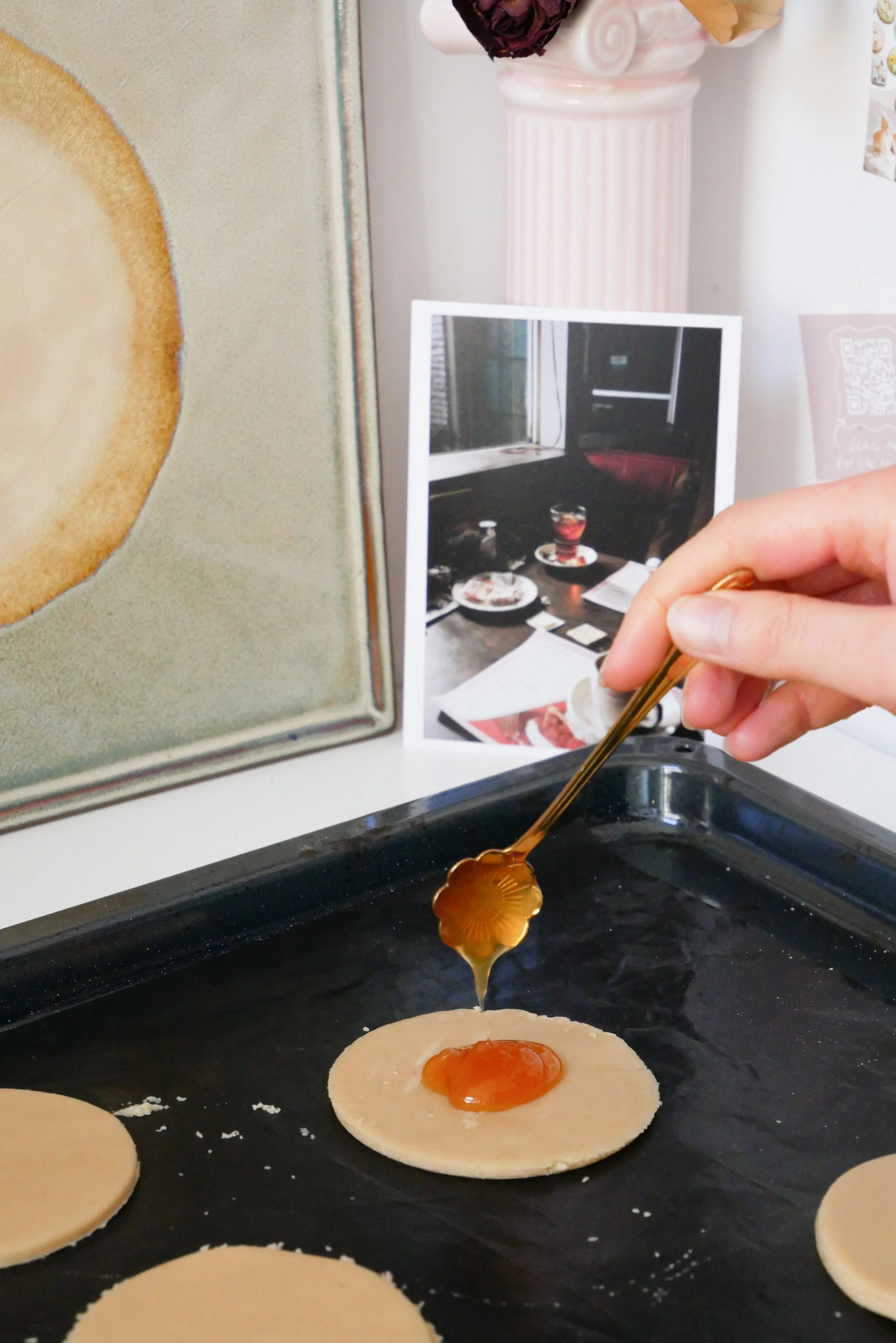 ein paar TL eurer liebsten Marmelade oder anderen süßen Füllung (Ich habe Aprikosenmarmelade benutzt, aber Vieles passt hier sehr gut! Ihr könntet z.B. auch Erdnussmus oder vegane Nuss-Nougat-Creme ausprobieren!)