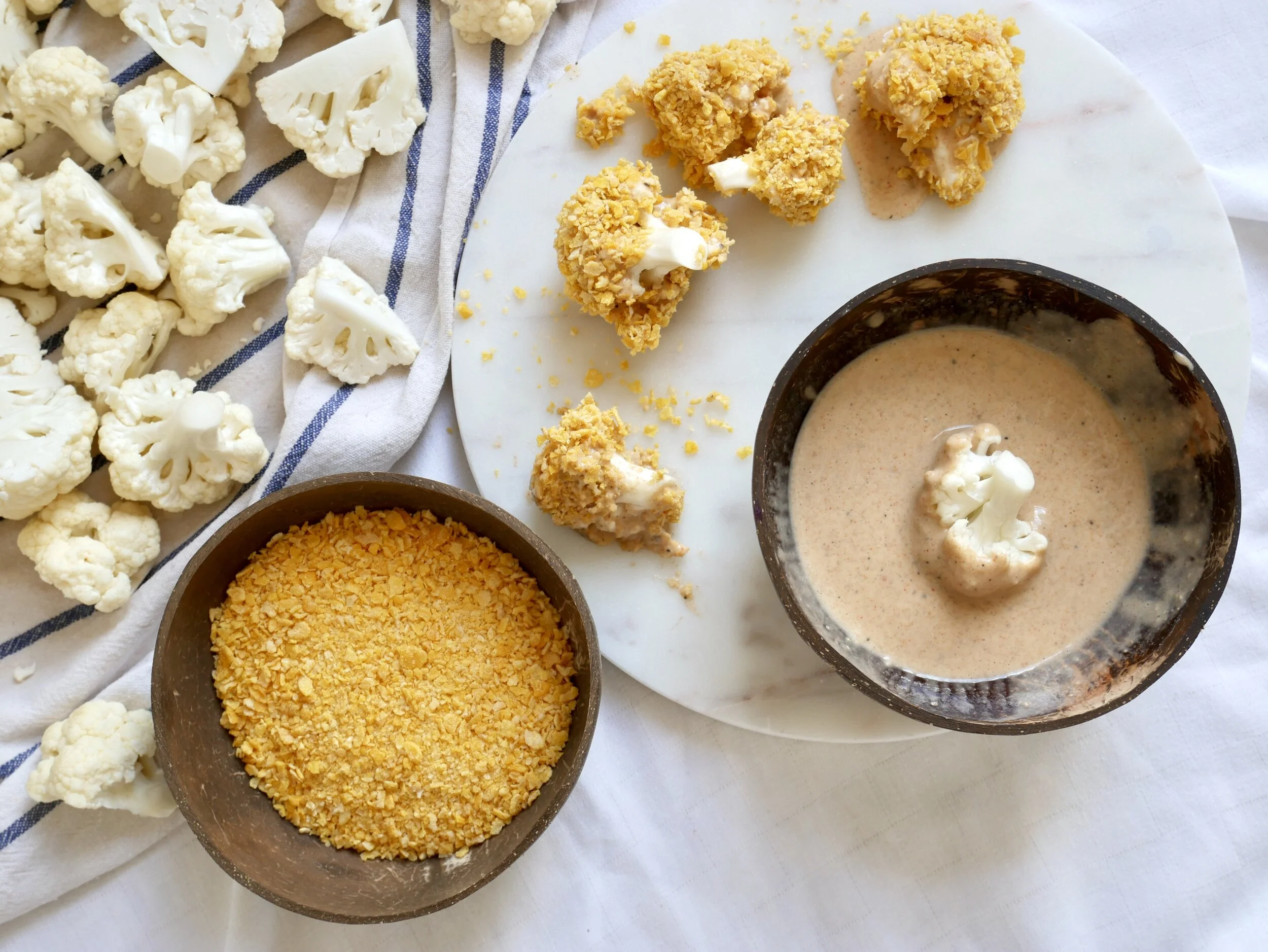 Die einzelnen Blumenkohlröschen zuerst in die Teigmischung tauchen und dann in den Maiscornflakes-Bröseln wälzen. Dabei optional die Stiele der Röschen frei lassen, sodass sie optisch an “Wings” erinnern.