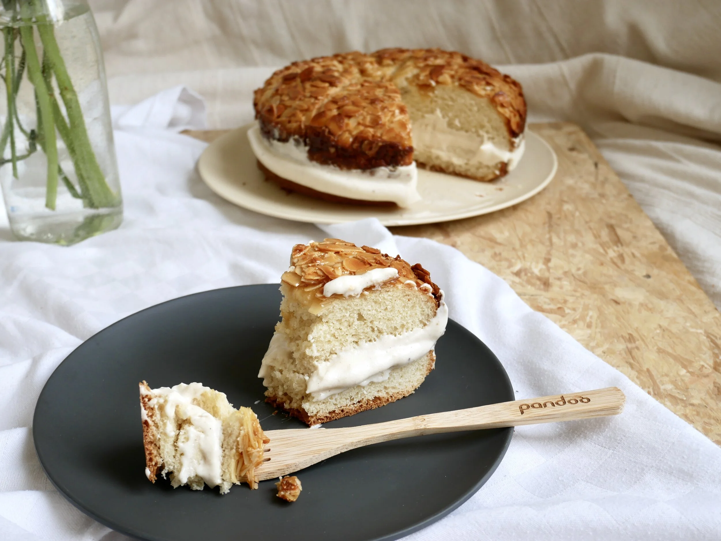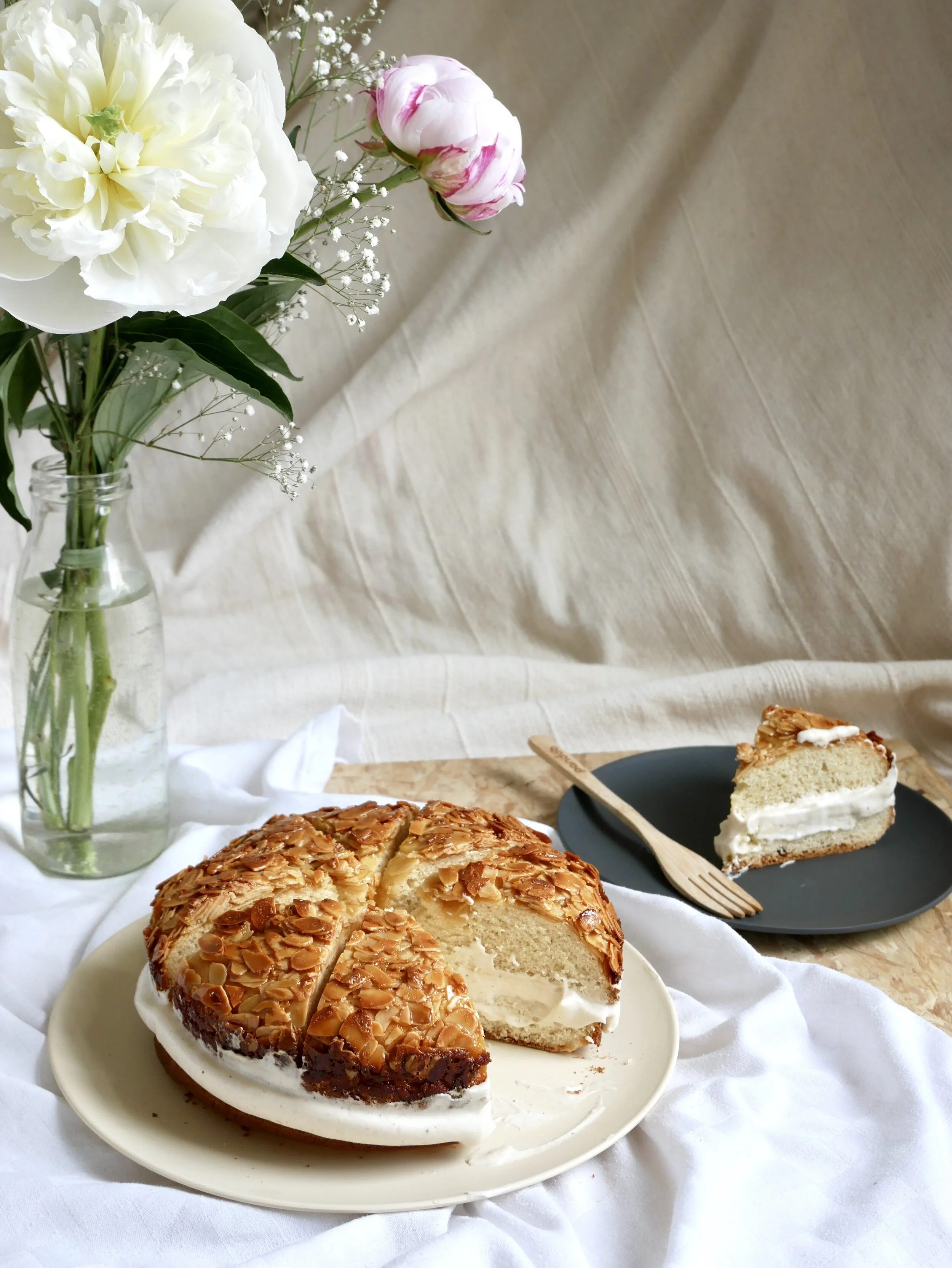 Ein fluffiger Hefeteig, eine cremige Vanillepudding-Sahne-Schicht auf Sojabasis und eine knusprig goldene Mandeldecke ergeben dabei zusammen eine wirklich ziemlich leckere Kuchenkreation! Dazu noch vegan und tierleidfrei wären sogar die kleinen Bienchen selbst große Fans, glaube ich.