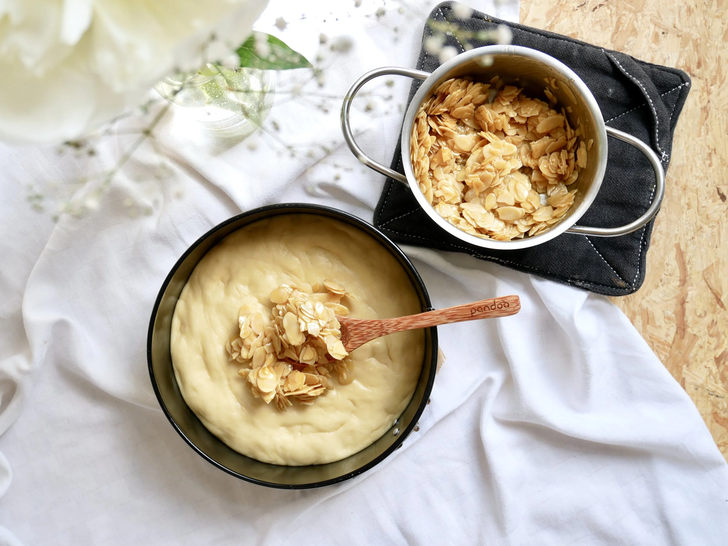 8. Das heiße Gemisch vom Herd nehmen und die flüssige vegane Sahne sowie die Mandelblättchen unterrühren. Anschließend die Mandel-Zucker-Masse gleichmäßig auf dem Hefeteig in der Springform verteilen und den Ofen auf 180°C Ober- und Unterhitze vorheizen.