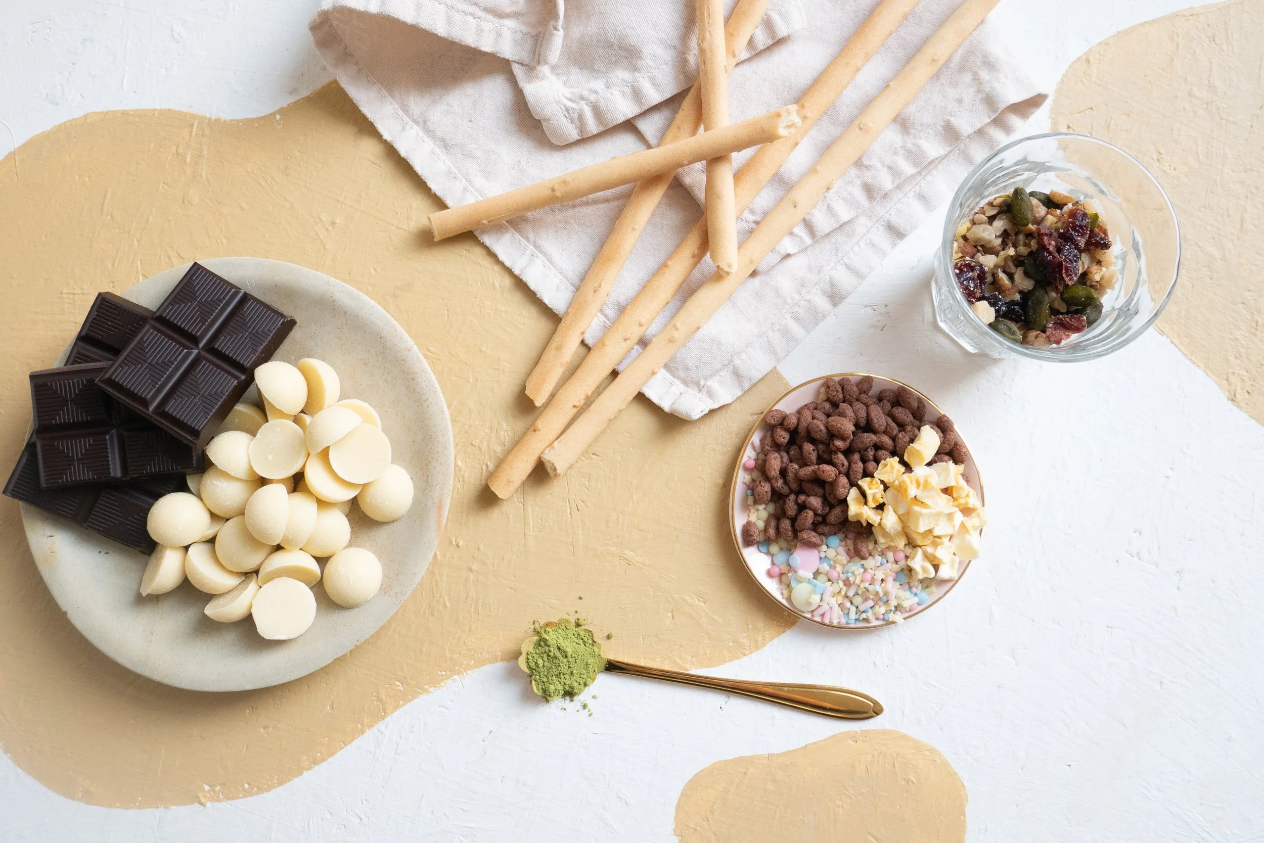 Genaue Zutatenangaben braucht es bei diesem Rezept eigentlich gar nicht. Nehmt einfach eure liebsten Toppings, Schokoladen und Brotsticks! Hier könnt ihr echt kreativ sein, meine Lieblingskombis sind zum Beispiel vegane weiße Schokolade mit Matcha, getrockneten Cranberries und Kokosraspeln oder dunkle Schokolade mit Lebkuchengewürz und zerbröselten Keksen oder Cini Minis! :)