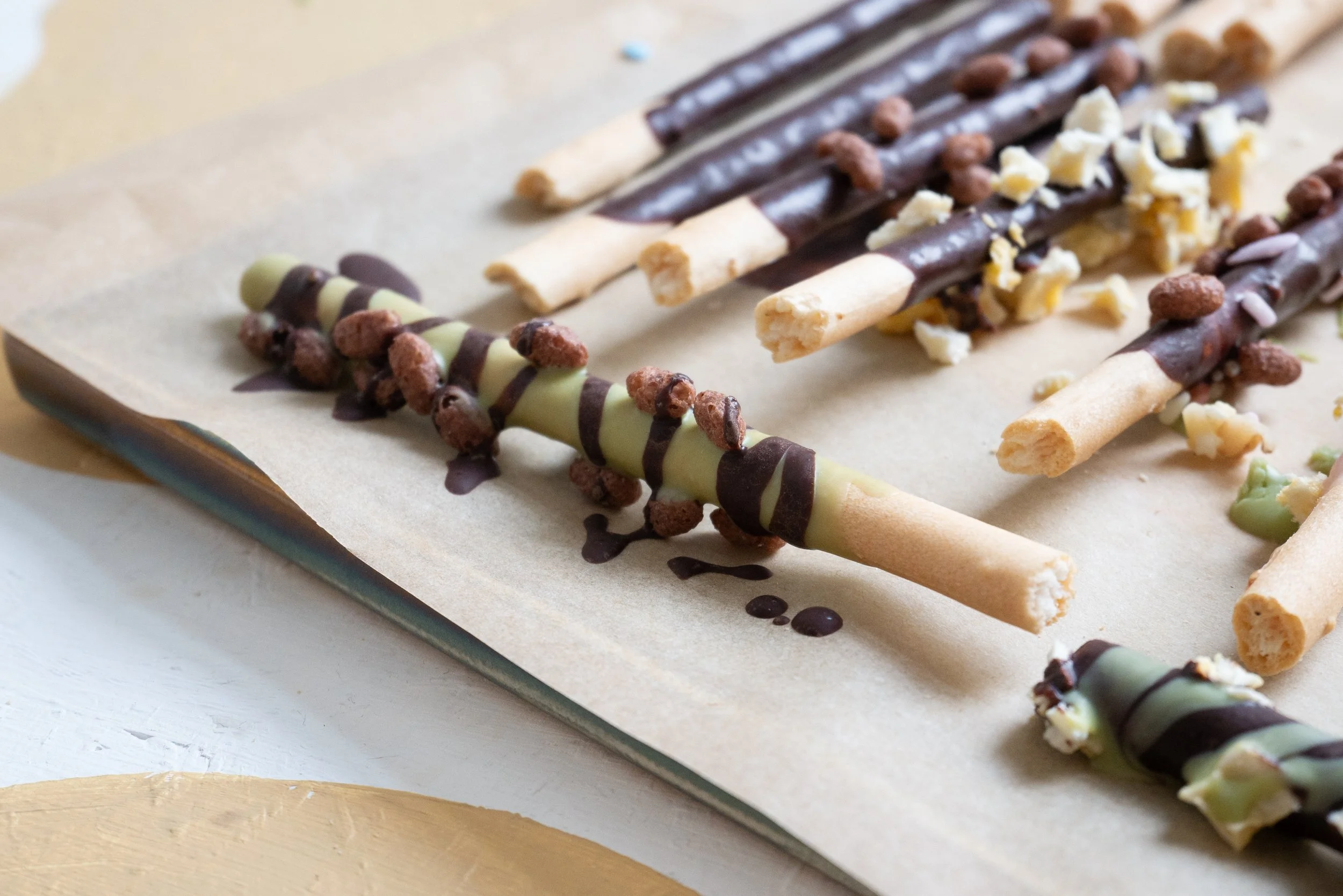 Nun die schokolierten Grissini mit den Toppings bestreuen und die fertigen Schokosticks auf etwas Backpapier legen und abkühlen lassen, bis die Schokolade wieder fest ist.