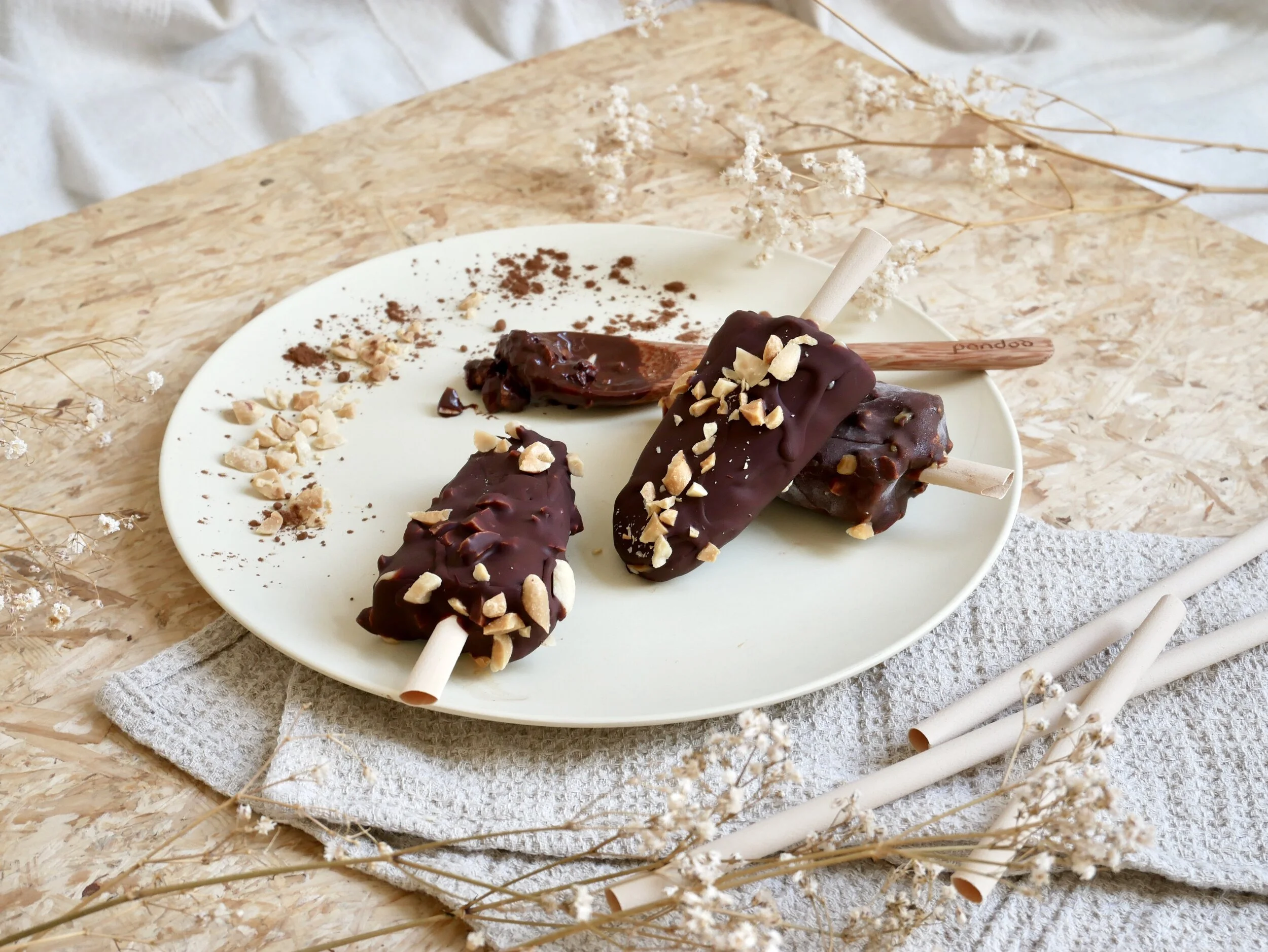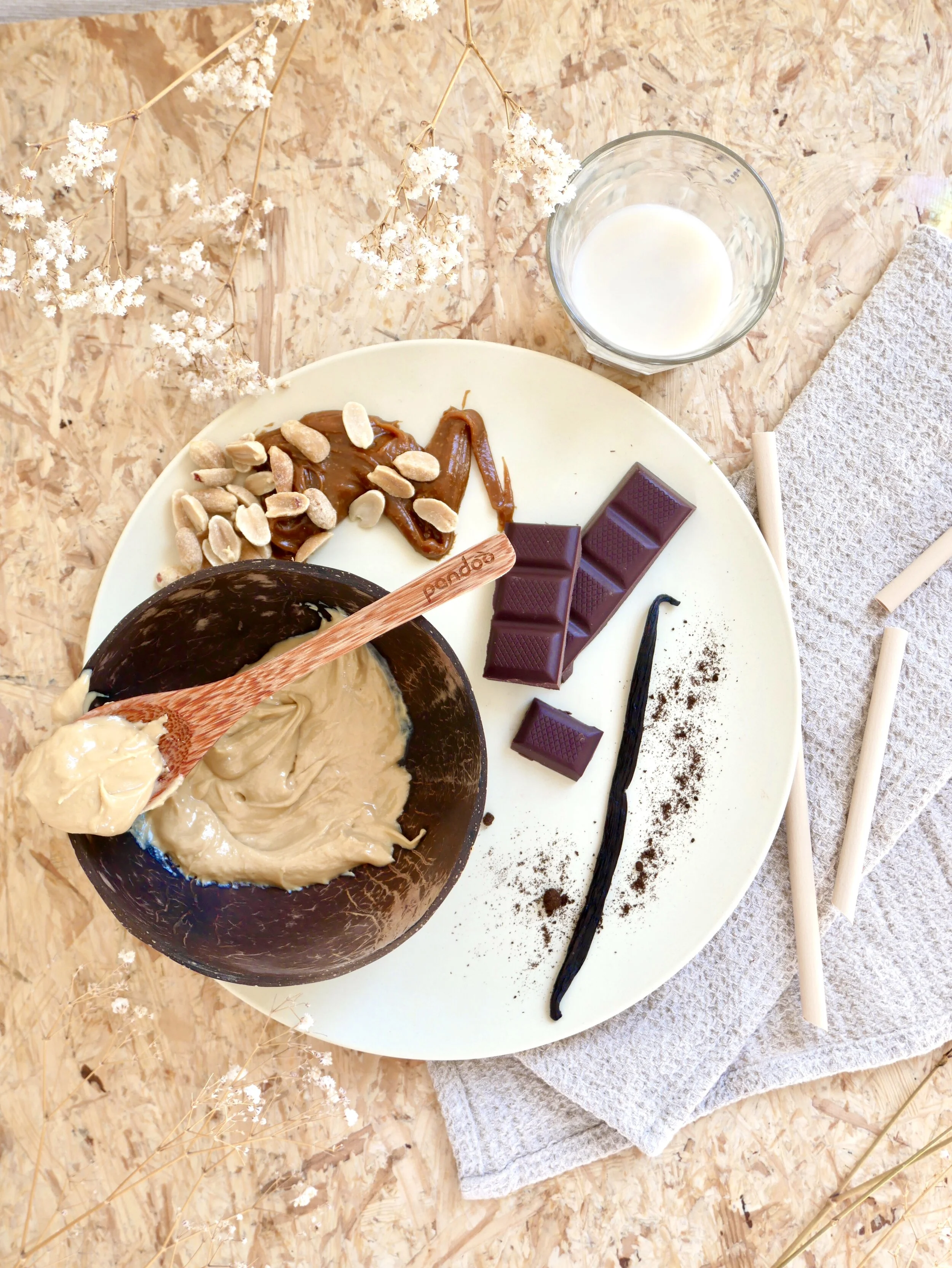 Ich habe hier zwar wiederverwendbare Eisförmchen verwendet, aber ihr braucht für dieses Rezept nicht zwingend solche speziellen Förmchen. Man könnte die Eis- und Karamellbasis zum Beispiel auch in einer Schale oder Tupperdose im Gefrierfach festwerden lassen und dann mit einem Eisportionierer Eiskugeln herausnehmen, welche man dann mit der geschmolzenen Schokolade und den Erdnüssen servieren kann. Oder man mischt die Schokolade direkt als Schokostückchen in die Eisbasis, der Fantasie sind hier keine Grenzen gesetzt!